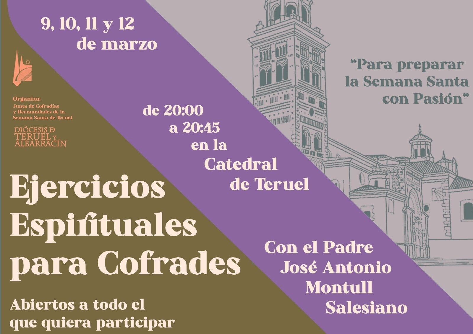 Serán a las ocho de la tarde en la Catedral de Teruel. Y estarán impartidos y dirigidos por el Padre José Antonio Montull, Salesiano. Esta actividad está organizada por la Junta de Cofradías y Hermandades de la Semana Santa de Teruel.